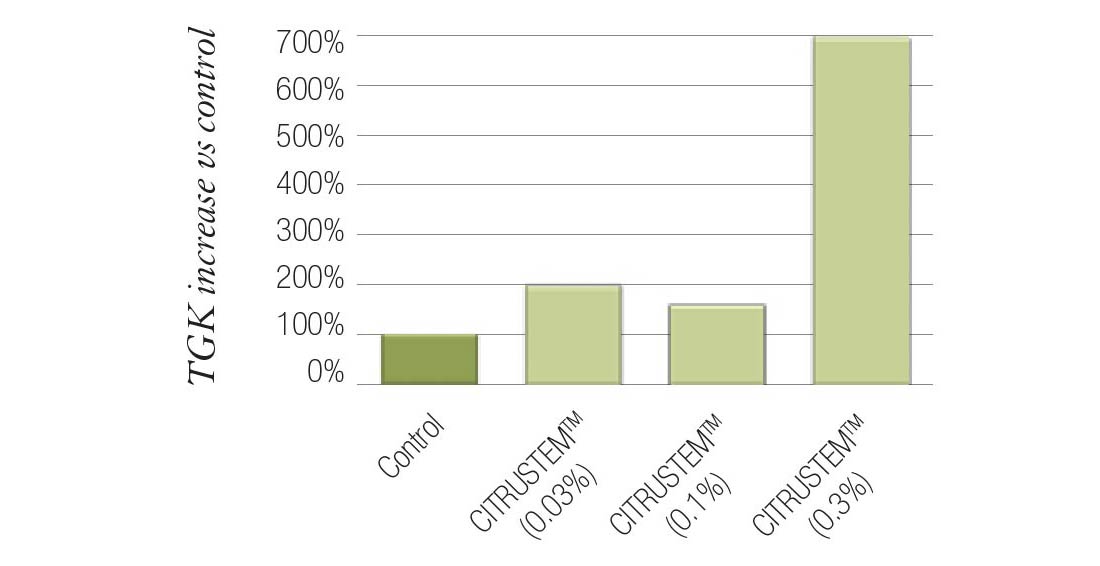 TGK, also known as keratinocytetransglutaminase, is a crucial enzyme found in the skin that strengthens the skin's barrier, keeping it healthy and protected. An increase in its synthesis means better organization of epidermal structures—levels are increased by 700%.